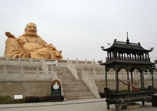 彌勒大佛臺(tái)位于九峰塔以南1000米處的龜背山頂。烏金山彌勒大佛由漢白玉雕琢而成,高9.9 米。彌勒大佛臺(tái)基座為三層,高5米。第三層為須彌座,前面浮雕為二十諸仙圖,西面為十八羅漢,東面為十二圓覺(jué),北面為十大明王,四角為四大金剛。從地面到佛頂共高14.9米。