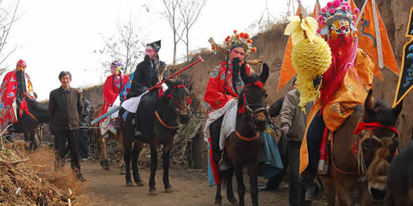 春節(jié),隴縣也叫過年。從臘月初八后,家家開始備辦年貨,準(zhǔn)備過年。臘月23日《送灶君》,也稱“送灶”、“掃舍”。臘月30日糊窗戶、貼窗花、年畫,貼對聯(lián)、門箋、門神畫,備酒菜、給祖先獻供饃、菜,燃香、點蠟燭,祭祖祀神,燃放鞭炮,開始過年。晚間全家團聚吃菜喝酒,晚輩給長輩拜年,長輩給小孩、新媳婦散發(fā)壓歲錢,說古道今、談工作、敘家常。午夜后,在院內(nèi)點燃一堆柏葉火,燃放鞭炮,插香接神,除舊歲,迎新春,稱之為“迎喜接福”。正月初一早晨,男女老少穿新衣,給祖先燒香叩頭。早飯吃餃子或臊子面,午飯擺酒席,吃饃食。初二之后,攜帶禮品,走親訪友,謂之“拜年”。此間各村裝扮社火游演,搭制秋千,人們盡情玩樂,享受新年的快樂。