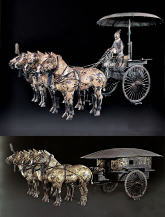 銅車馬是秦始皇的陪葬品之一,象征著秦始皇鑾駕的一部分。銅車馬的形制是模仿實(shí)實(shí)在在真車的形狀。以前考古發(fā)現(xiàn)的車都是木質(zhì)的,出土?xí)r已腐朽,銅車馬的出土使今人能夠清楚地看到古代御用車駕的真實(shí)面貌。銅車馬是按秦始皇御用車隊(duì)中屬車二分之一的比例縮小制成的,車蓋以及車輿內(nèi)外彩繪著精美的紋樣;兩乘銅車馬上的金銀飾品重達(dá)14公斤,顯示了銅車馬高貴的等級(jí)。
