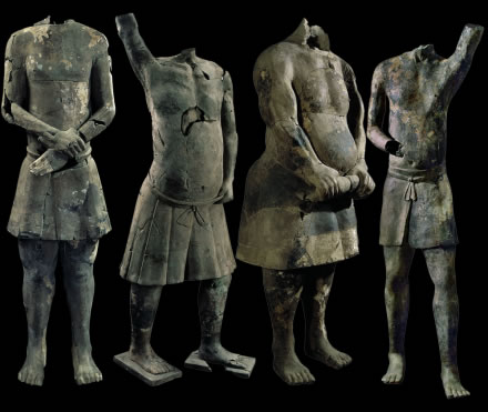 此套展品為秦代的陶器,出土于秦始皇帝陵K9901陪葬坑。一號(hào)百戲俑,殘高152.00厘米,右臂有刻劃文字“咸陽親”。三號(hào)百戲俑,殘高172.00厘米。四號(hào)百戲俑,殘高152.00厘米。十九號(hào)百戲俑,殘高181.00厘米。1999年,考古人員在秦陵東南部內(nèi)外城垣之間的陪葬坑內(nèi),試掘出土了陶俑11件,它們上體裸露,下體著裳。動(dòng)作有直立狀、雙手卷衣狀、一手叉腰一手高舉、雙腿弓箭步、半跪狀等。