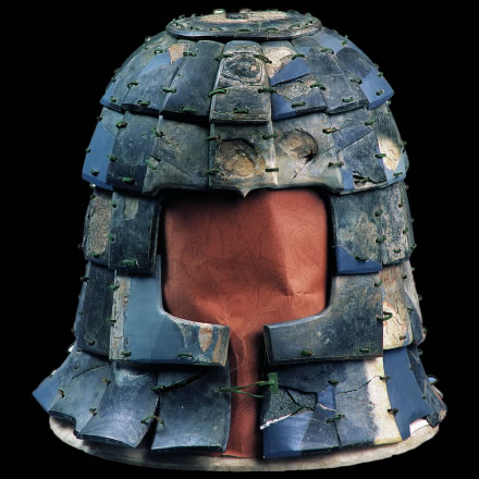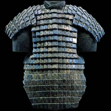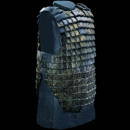 此展品為秦代的石器,通長64.00厘米,出土于秦始皇帝陵K9801陪葬坑。鎧甲由前、后身甲和一對披膊組成,共有甲片380片。鎧甲的開合口位于右側(cè)肩、胸的交接處。