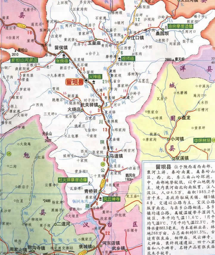 留壩縣地處陜西省西南,漢中市北部,東連洋縣、城固,南接漢臺,西鄰勉縣,北靠太白、鳳縣 。東經(jīng)106°38′05〞-107°18′14〞,北緯33°17′42〞-33°53′29〞。全縣總面積 1958 平方公里 , 東西長 46.4 公里,南北寬 67.2 公里。距西安 367 公里 ,距漢中 85 公里。