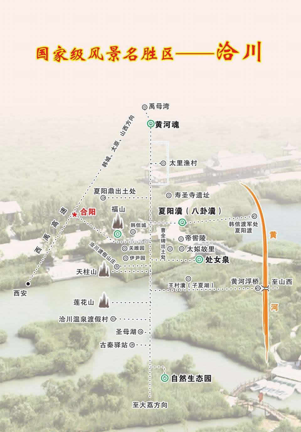 1995年經(jīng)陜西省政府批準(zhǔn)設(shè)立的洽川風(fēng)景名勝區(qū),2004年被列為國家級風(fēng)景名勝區(qū),堪稱中華一絕。景區(qū)位于縣城以東20公里的黃河西岸,面積176平方公里。景區(qū)內(nèi)有黃河流域最大的蘆葦蕩(10萬畝)和最大的濕地保護(hù)區(qū)(15萬畝),白天鵝、丹頂鶴、黑鸛、大鴇等百余種國家一、二級保護(hù)動物在此棲息。景區(qū)的7處瀵泉天下獨(dú)有,其中"處女泉"最為神奇,人入水不沉,泉涌沙動,如綢佛身,如沙浪浴,是名符其實的"華夏一絕"。"萬畝蘆蕩,千眼神泉,百種珍禽,十里荷塘,一條黃河,秦晉相望",是洽川風(fēng)景名勝區(qū)的真實寫照。觀洽川景,游處女泉,住農(nóng)家院,享農(nóng)家樂,擁抱母親河已成國內(nèi)外游客的神往。