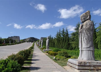 從梁山南二峰的天然雙闕起,往北依次對稱排列。端立首位的是1對高達(dá)8米有余的八棱柱石華表,這是帝王陵墓的標(biāo)志,其造型昭示著生命長存的理念和古代先民對人類生殖行為的崇拜。接著是一對昂首挺胸、渾圓壯觀的石刻翼馬,馬身兩翼雕以卷云紋,似有騰飛之勢。翼馬之北是1對優(yōu)美的高浮雕鴕鳥,是唐王朝同西域人民文化交流與友好往來的象征。緊接鴕鳥的是5對配有馭手的石仗馬和10對高4米左右的石翁仲(或稱直閣將軍)。