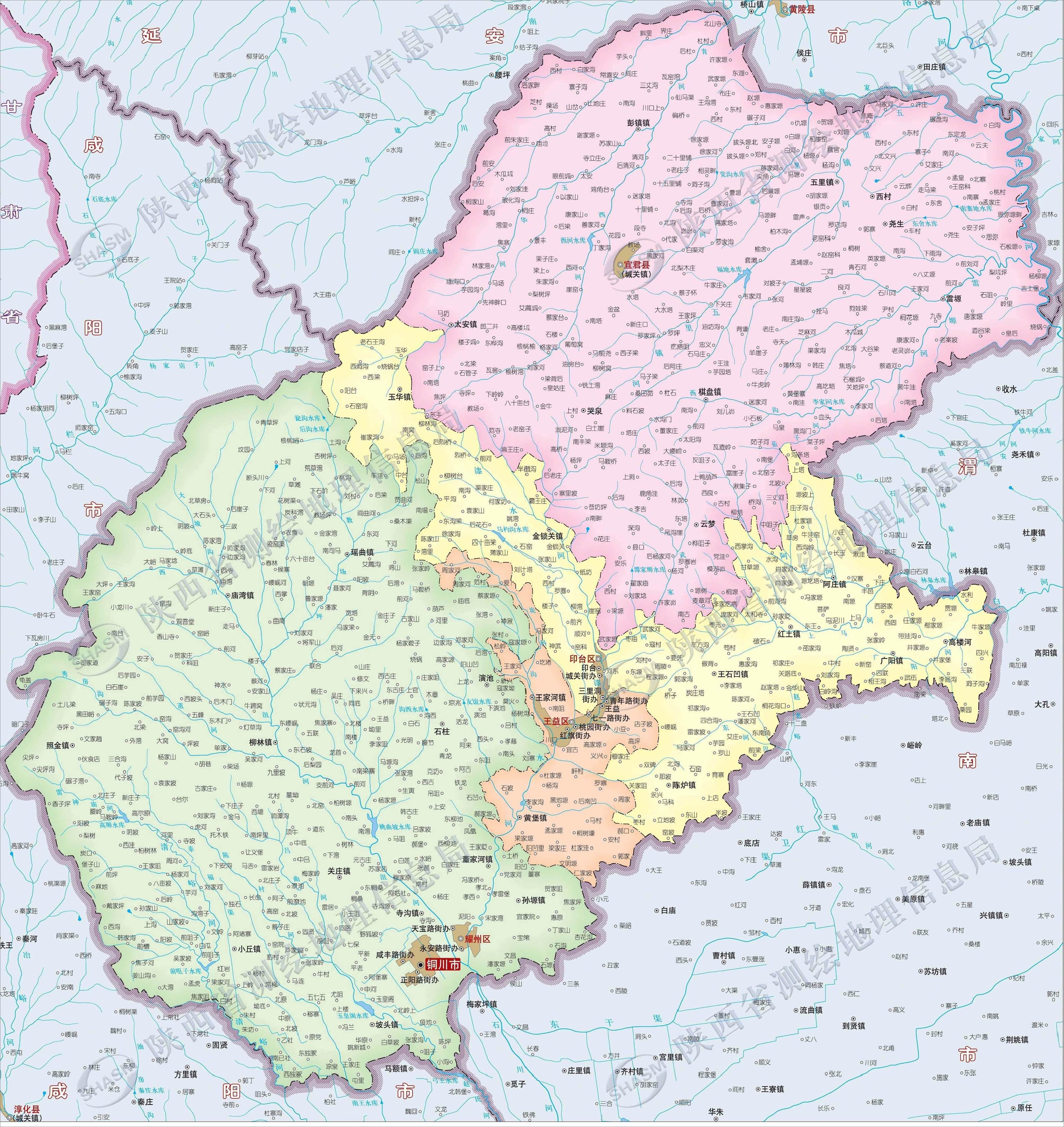 銅川市位居陜西中心,陜北黃土高原的南緣。東和東南與渭南市的白水縣、蒲城縣、富平縣接壤,西和南與咸陽市的旬邑縣、淳化縣、三原縣毗連,北和西北與延安市的洛川縣、黃陵縣相鄰;東西最寬為80.97千米,南北最長為84.025千米。區(qū)劃總面積3882平方千米,占全省總面積的1.9%。