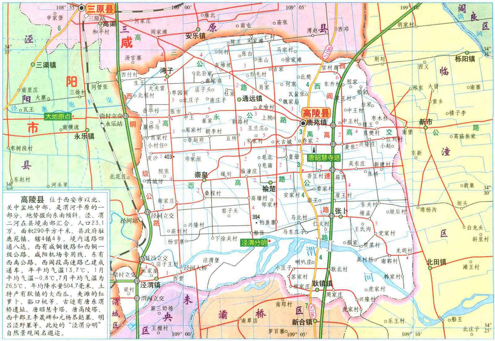 高陵縣地勢(shì)平坦,土壤肥沃,人稱關(guān)中的“白菜心”。東靠臨潼區(qū),南接未央、灞橋區(qū),西連咸陽(yáng)渭城區(qū)、三原縣、涇陽(yáng)縣,北臨閻良區(qū),屬西安市近郊縣,距西安市中心僅20公里,距咸陽(yáng)國(guó)際機(jī)場(chǎng)10公里。涇渭二水橫貫東西,西禹、西銅高速公路、210國(guó)道及西延鐵路橫貫?zāi)媳保瑳芎踊疖?chē)站位于其中。“五區(qū)、二水、四線”已緊密地把高陵縣與西安市融為一體。