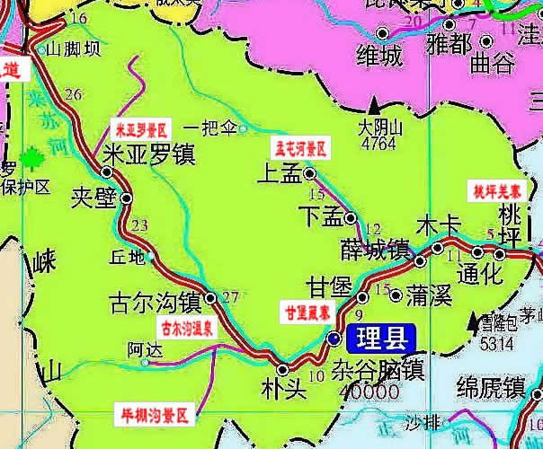 理縣位于四川省西部,青藏高原東部,阿壩藏族羌族自治州東南緣,地處北緯30°54′43″—31°12′12″,東經(jīng)102°32′46″—103°30′30″。國道317線沿雜谷腦河貫穿全境,東北與茂縣、黑水接壤,西南與小金相連,東南與汶川相通,西北與馬爾康、紅原毗鄰。全縣總幅員面積為4313.42平方公里,距離省會成都202公里,距州府馬爾康193公里。