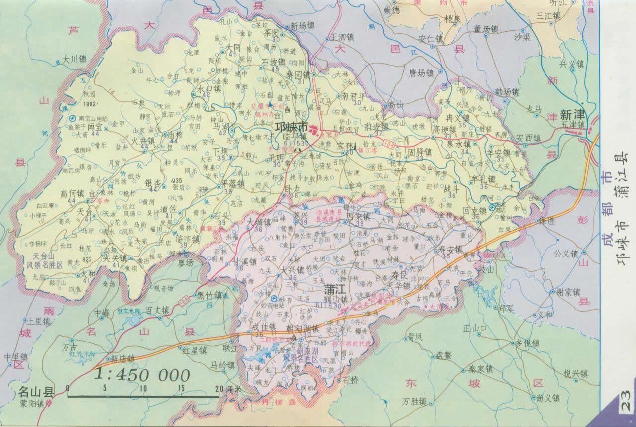 中華人民共和國成立后,蒲江縣于1949年12月19日解放。1950年中央人民政府決定,將四川劃為川西、川東、川南、川北4個行署區(qū),行署區(qū)下分置分區(qū)行政督察專員公署;蒲江縣屬川西行署眉山分區(qū)(通稱專區(qū))。1952年9月1日撤銷全川4個行署區(qū),恢復(fù)四川省建制;同年10月,改分區(qū)行政督察專員公署為區(qū)專員公署,蒲江縣屬四川省眉山專區(qū)。1953年3月10日,撤銷眉山專區(qū),邛崍、蒲江、新津、名山4縣劃歸溫江專區(qū)。1960年4月29日經(jīng)國務(wù)院第100次會議通過,決定撤銷蒲江縣,所屬行政區(qū)劃歸邛崍縣(邛、蒲實際合縣時間:1959年2月,涉及合縣時間資料,以實際合縣時間為準(zhǔn))。1962年10月20日國務(wù)院批準(zhǔn),復(fù)置蒲江縣,蒲江縣仍屬溫江專區(qū)。1968年9月,“專區(qū)”改為“地區(qū)”,蒲江縣屬溫江地區(qū)。1983年3月3日,國務(wù)院《(83)國函字第26號》文批復(fù),撤銷溫江地區(qū),將所轄溫江、蒲江等10縣劃歸成都市管轄。