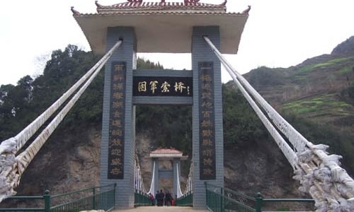 固軍索橋 萬(wàn)源市固軍鄉(xiāng)中河村是萬(wàn)源市2005年“7.8”洪災(zāi)的重災(zāi)村,洪災(zāi)沖毀中河村原有鋼絲橋致中河兩岸2900余人無(wú)法過(guò)河、運(yùn)輸。固軍中河索橋建設(shè)工程得到省以工代賑辦大力支持并被列為2005年省管重點(diǎn)項(xiàng)目,主體工程投資30萬(wàn)元,其中國(guó)家投入以工代賑資金15萬(wàn)元,下差資金由當(dāng)?shù)卣腿罕娮曰I解決。該工程由萬(wàn)源市交通局設(shè)計(jì)施工圖紙并負(fù)責(zé)技術(shù)監(jiān)管,橋設(shè)計(jì)為鋼筋混凝土斜拉索橋,全長(zhǎng)95延米,寬3.5米,可承受5噸以下的微型車輛通行。