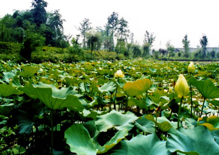潭內(nèi)種植有許多觀賞荷花,初夏時節(jié),碧荷連天、綠滿大地、蓮花朵朵,香飄滿園。輕風(fēng)吹過,花兒嬌羞欲語、隨風(fēng)起舞、揺曵生姿,為這寧靜的湖光山色憑添了許多的生機和靈氣。由此讓我們不禁想到周敦頤的《愛蓮說》:“蓮,花之君子者也!薄俺鲇倌喽蝗荆鍧i而不妖,中通外直,不蔓不枝,香遠益清,亭亭靜植,可遠觀而不可褻玩焉。”