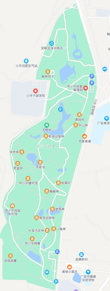 2004年8月,成立鄧小平紀念館;同年12月,更名為鄧小平故里管理局,負責(zé)管理和保護鄧小平故里紀念園區(qū)和佛手山風(fēng)景區(qū)。鄧小平故里現(xiàn)有全國重點文物保護單位6處,以及民俗民風(fēng)等自然景觀多處。園內(nèi)按文物維修原則修繕了鄧小平故居、蠶房院子、翰林院子、德政坊、神道碑、放牛坪、清水塘、鄧家老井、洗硯池、鄧紹昌墓等近20處鄧小平同志青少年時期的活動場所。