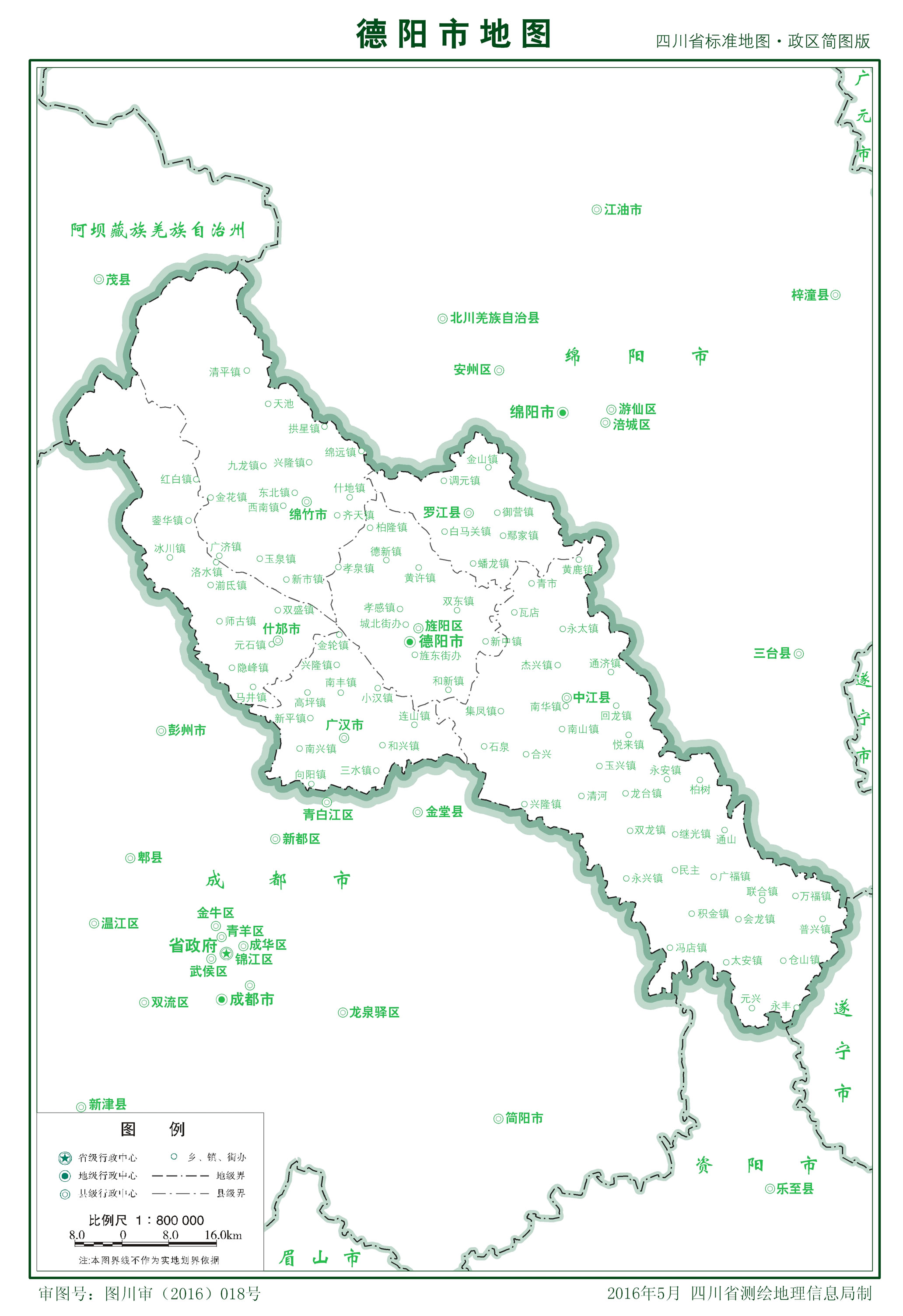 1983年8月18日,國(guó)務(wù)院函安(1983)156號(hào)文批復(fù):“同意設(shè)立德陽(yáng)市。德陽(yáng)市駐德陽(yáng)城關(guān),轄城區(qū)街道辦事處、漢旺鎮(zhèn)和旌陽(yáng)、城區(qū)、八角三個(gè)公社。將綿陽(yáng)地區(qū)的德陽(yáng)、中江、綿竹三縣和成都市的廣漢、什邡2縣劃歸德陽(yáng)市管轄!