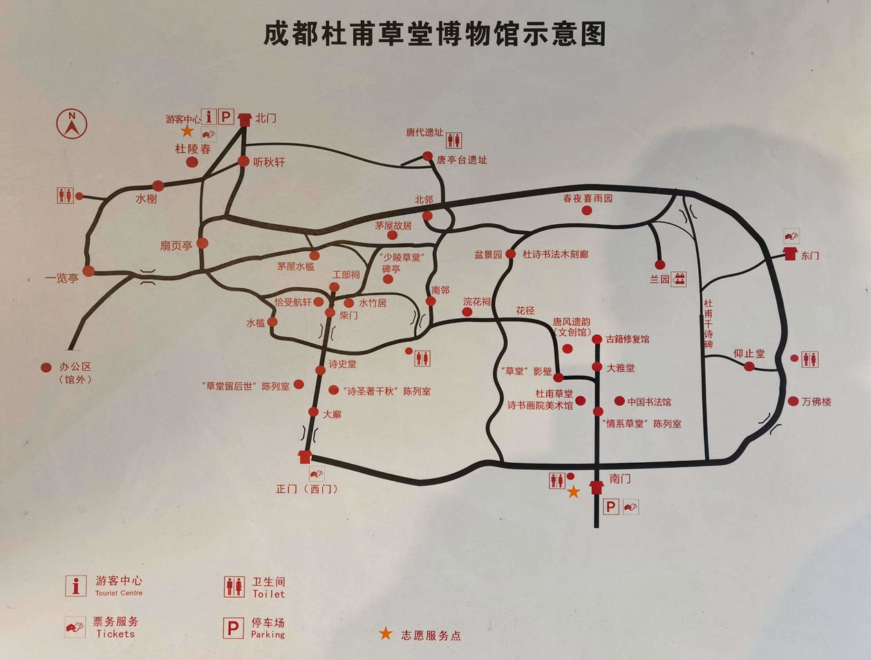 博物館按功能區(qū)分為:文物景點(diǎn)游覽區(qū)(草堂舊址)、園林景點(diǎn)游覽區(qū)(梅園)和服務(wù)區(qū)(草堂寺)。草堂舊址內(nèi),照壁、正門(mén)、大廨、詩(shī)史堂、柴門(mén)、工部祠排列在一條中軸線上,兩旁配以對(duì)稱的回廊與其它附屬建筑,其間有流水縈回,小橋勾連,竹樹(shù)掩映,顯得既莊嚴(yán)肅穆、古樸典雅而又幽深靜謐、秀麗清朗。工部祠東側(cè)是“少陵草堂”碑亭,象征著杜甫的茅屋,已成為杜甫草堂的標(biāo)志性景點(diǎn)和成都的著名景觀。