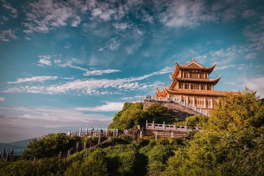 峨眉山(Mount Emei)位于北緯30°附近,四川省西南部,四川盆地的西南邊緣,是中國(guó)“四大佛教名山”之一,地勢(shì)陡峭,風(fēng)景秀麗,素有“峨眉天下秀”之稱(chēng),山上的萬(wàn)佛頂最高,海拔3099米,高出峨眉平原2700多米。《峨眉郡志》云:“云鬘凝翠,鬒黛遙妝,真如螓首蛾眉,細(xì)而長(zhǎng),美而艷也,故名峨眉山!