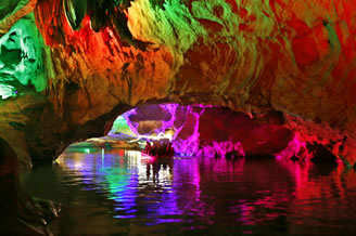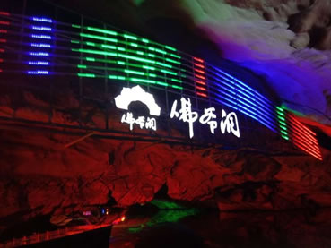由南天門往右,沿著崎嶇的“盤陀路”進入第二殿,隨著“一柱廳”、“半天山”到達約有450平方米寬的“東海龍宮”那里“定海神針”直立,“五彩神泉池”水色清澈晶瑩,不寒而栗有“白龍越江奪寶”、“頑猴望”、“海獅戲蓮”、“別甲神鷹鎮(zhèn)金沙”、“龍王百寶箱”等天然造型,氣勢磅礴,極為壯觀。龍宮內洞中有洞、景中有景!拔淞陥@”有牛角尖、簸箕天,海螺洞中有“鶴蚌相爭”、“海螺觀戰(zhàn)”、“鳴鑼助戰(zhàn)”、“石床”等石筍、鐘乳石造型,相映成趣,目不暇接。然而,“山有洞天不算奇,陰河劃船數(shù)第一”。沿著灣灣曲曲的跳蹬路,耳聽潺水聲,觀看“地海橫鯨”、“青蛙駝蓮”、“天地桃”、“美猴照鏡”等景點來到陰河劃船處——“凱旋門”、只見幽幽碧水,微泛漣漪,各種燈光倒映水中的燈景冉冉浮動。