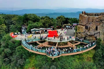 “懸空玻璃景觀平臺”位于景區(qū)的最高點,劍門關(guān)景區(qū)大劍山主峰上,該平臺建成面高程為1163.800m,懸挑部分采用鋼結(jié)構(gòu),其鋼結(jié)構(gòu)的鋼梁采用兩種“工”字疊加組成。主景觀平臺懸空跨度25mm,平臺面層采用高強多層疊合玻璃鋪面,玻璃厚度約6cm,平臺距崖底高約150m,懸空玻璃觀景臺懸挑長度為世界第二、亞洲第一,僅次于美國科羅拉多大峽谷國家公園懸空玻璃觀景廊橋。橋面設計寬度為3米,橋梁凈跨約20米古樹,景觀玻璃平臺與古樹,古木石雕等相呼應,游客行走其上,可高空俯瞰體驗劍門關(guān)景區(qū)的雄、奇、險、秀。