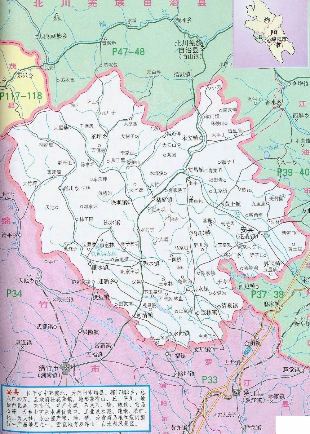 安縣位于四川盆地西北部,距成都110公里,距綿陽(yáng)科技城10公里?h境山丘壩兼有,幅員1404平方公里??cè)丝?0萬(wàn)人,轄4鄉(xiāng)16鎮(zhèn)。安縣氣候宜人,生態(tài)環(huán)境優(yōu)美。屬亞熱帶濕潤(rùn)季風(fēng)氣候,氣候溫和,雨量充沛,四季分明,日照充足,無(wú)霜期長(zhǎng)。年均氣溫16.3℃,年均降水量1260mm,空氣質(zhì)量常年達(dá)國(guó)家二級(jí)標(biāo)準(zhǔn),森林覆蓋率達(dá)42%?h內(nèi)交通四通八達(dá),人流、物流進(jìn)出快捷方便 ,現(xiàn)代通訊覆蓋全縣,并開通了ADSL業(yè)務(wù)和高速寬帶網(wǎng)絡(luò),光纖有線電視遍布城鄉(xiāng)。自然資源豐富,有水泥石灰石、磷礦、煤、硫鐵礦、重晶石、鋁土礦等礦產(chǎn)資源29種,儲(chǔ)量豐富;有動(dòng)物資源948種,其中大熊貓、金絲猴等國(guó)家一、二級(jí)保護(hù)動(dòng)物77種;有植物資源814種,其中銀杏、珙桐等國(guó)家一級(jí)珍稀植物及棗皮、杜仲、烏藥等中藥材資源100多種。工業(yè)基礎(chǔ)良好。電子、建材輕化、能源、化工、食品等支柱工業(yè)日益壯大。農(nóng)業(yè)生產(chǎn)條件優(yōu)越,農(nóng)村經(jīng)濟(jì)持續(xù)發(fā)展。雜交水稻制種、優(yōu)質(zhì)水稻、無(wú)公害蔬菜、水果、無(wú)規(guī)定疫病畜禽養(yǎng)殖、水產(chǎn)、蠶桑、魔芋、棗皮等農(nóng)業(yè)產(chǎn)業(yè)化經(jīng)營(yíng)蓬勃發(fā)展。