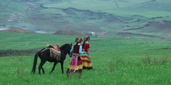 跑馬坪生態(tài)環(huán)境教育區(qū)位于覺嘎失山頂呈波狀起伏的亞高山草甸中,面積達(dá)10萬(wàn)平方米以上,草甸中部有一長(zhǎng) 約200米的天然環(huán)形溝槽,雨季時(shí)溪流清澈但不見首尾。草甸東側(cè)形成若干草甸沼澤化淺水區(qū),且有矮型高山櫟,矮林型杜鵑點(diǎn)綴其中。海拔3105~3185米之間。本區(qū)特色為亞高山灌叢凸現(xiàn)于亞高山草甸中,草甸東側(cè)形成若干草甸沼澤化淺水區(qū)大面積的高山草甸生長(zhǎng)著茂盛的中生雜草和和禾草,為糙蘇羽衣草群系。其它主要伴生種有小米草、瀴蔢草、金蓮花、假水蘇禾龍膽等。騎馬徜徉在跑馬坪上讓人覺得天寬地迥,暢意無(wú)限。其景觀見圖二