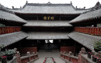 家慶堂屋頂為歇山頂,整個(gè)殿宇雄偉華麗,它的屋頂脊飾很有特色。正脊正中有三重樓閣,樓閣之上有寶頂,樓閣后底部雕塑有彌勒佛;9個(gè)脊梁之上都有蹲獸,在4個(gè)翼角戧脊之上塑有天上四靈,以正四方。什么是“四靈”呢?就是青龍、白虎、朱雀、玄武;為何要塑“四靈”?因?yàn)楣湃顺S小白簖堄一⒈俨幌,朱雀玄武順陰陽”的說法。在歇山下邊的正中位置,還有“上有仙人不知老,渴飲玉泉饑食棗”等生動有趣的裝飾性塑像。如果站在代表二十四孝的石階下仰望整個(gè)家慶堂時(shí),更會有華麗多彩、猶如海市蜃樓的感覺。