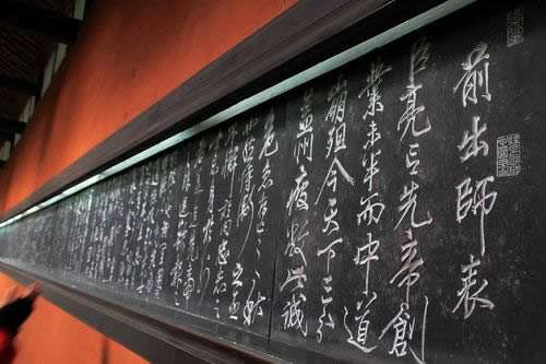 諸葛亮殿的東西廂是書屋、客室,鐘樓、鼓樓峙立大殿二角。諸葛亮殿內(nèi)供祀著諸葛亮的貼金泥塑坐像,左側(cè)是諸葛亮之子諸葛瞻,右側(cè)是諸葛亮的孫子諸葛尚。塑像前有銅鼓三面,鑄于公元六世紀之前,傳說是南征夷蠻時所用。大殿后壁嵌有許多石刻,東壁是當代書法家沈尹默書寫的諸葛亮 《隆中對》 ,表達的是“三顧頻繁天下計,兩朝開濟老臣心”的壯志雄心;西壁則是宋代名將、“精忠報國”的民族英雄岳飛所書的諸葛亮 《出師表》 ,“鞠躬盡瘁,死而后已”名句傳誦千古,忠誠執(zhí)著的浩然正氣氣貫長虹。殿內(nèi)外匾對甚多,都是對諸葛亮的謳歌和追思。