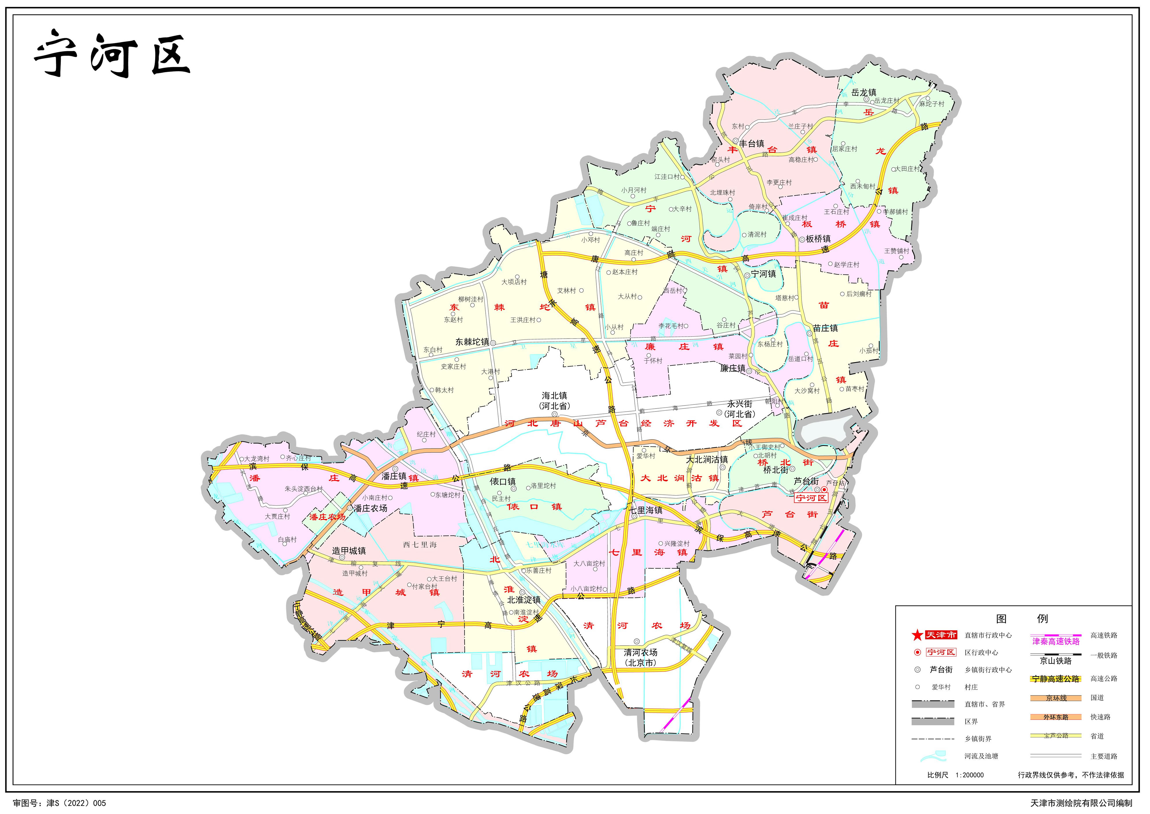 鎮(zhèn):寧河鎮(zhèn)、苗莊鎮(zhèn)、豐臺(tái)鎮(zhèn)、岳龍鎮(zhèn)、板橋鎮(zhèn)、潘莊鎮(zhèn)、造甲城鎮(zhèn)、七里海鎮(zhèn)、大北澗沽鎮(zhèn)、東棘坨鎮(zhèn)、北淮淀鎮(zhèn)、俵口鎮(zhèn)、廉莊鎮(zhèn)