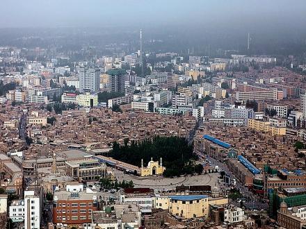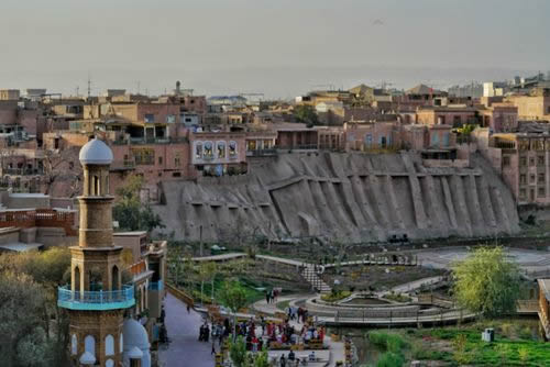 清朝自1760年在喀什噶爾設(shè)參贊大臣之后,作為天山以南的政治、經(jīng)濟(jì)、文化和交通中心,喀什噶爾城人口激增,舊城區(qū)居住不下,開始向今解放路以西拓展。1762年筑徠寧城,與舊城只隔不足1公里。到1839年,徠寧城與舊城之間的地帶已全建為民居,清朝駐喀什噶爾阿奇木伯克郡王祖赫爾丁(即史書中所稱“阿肯木伯克早敦”)主持了擴(kuò)城工程,將城西墻移至今尤木拉克協(xié)海爾路,與原徠寧城相連,在今老郵電局處新辟南門,稱“庫木代爾瓦扎”(沙門),南關(guān)一帶成為繁華的手工業(yè)區(qū),形成了以艾提尕大清真寺為中心的一座新城。