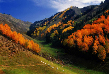 孜沿氈溝和馬鹿溝:溝谷內谷深流急,濤聲隆隆,河水清涼純凈,河岸時而危巖矗立,時而寬闊平坦。溝谷內植物依高矮不同分成5層,最高一層是云杉的圓錐形樹冠層,第2層是天山花楸,第3層是薔薇、忍冬、紅果小蘗,第4層是羽衣草、早熟禾、鹿蹄草、唐松草、天山鳶尾、高山羊角芹等200多種草本植物層,第5層是苔蘚、地衣。它們或相互依存,或獨在一方,把中山峽谷裝點得千種姿態(tài)、萬種風情。溝谷內野生動物種類繁多,獸類有馬鹿、狍子、野豬、棕熊、狐貍、猞猁、石貂、艾虎、野兔等,鳥類有石雞、斑翅山鶉、黑鸛、柳鶯、星鴉、金額熊雀、紅額金翅雀、朱雀、鳶尾等。
