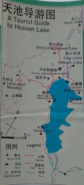 燈桿山(禪燈山):海拔2718米,在距大天池西岸約4公里處(一說三公里),山體呈南北走向,長3公里許,寬約2公里,可游面積0.2平方公里,是天池西側群峰第二高峰,屬中山峽谷森林帶;山上有大片牧場,老君廟、東岳廟均建于此,過去曾有道士在山頂立一上掛天燈的松桿,晝夜不滅預示世道太平,又稱太平燈;燈桿山是極佳的觀景地,上可遙望博格達雪峰、下可俯瞰天池全貌,“西山觀松”和觀看日落等也是絕佳的位置;由此西眺,烏魯木齊可盡收眼底,尤其在夜晚華燈初上之際,可遠觀烏魯木齊萬家燈火。相傳這座山上立的上掛“天燈”的松桿是人們?yōu)榱思o念菩提達摩在對面的“達摩禪洞”里思考和所傳的禪法。循大天池西側盤山公路向上數(shù)百米,見路邊“新疆瑤池國際旅行社中國天山天池馬克·鐘度假村”(內有絲綢古道馬克鐘餐飲廣場等),再向上約3公里便可到達。