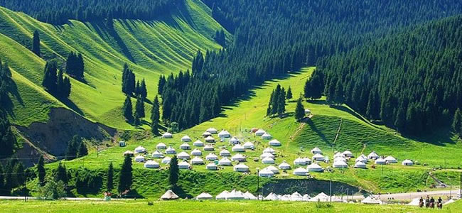 南山西白楊溝位于烏魯木齊南郊,距市區(qū)75千米,屬北天山的喀拉烏成山北麓,地處中山與低山過(guò)渡帶,海拔2252公尺,年降雨量500-600毫米。溝谷最里邊有一天然絕壁,其上,一條落差40余,寬約2米的飛瀑如白練飄舞,急瀉而下。草坡上有南山風(fēng)景管理處開(kāi)辦的氈房招待所,坡下有餐廳,可滿足游人食宿需要。