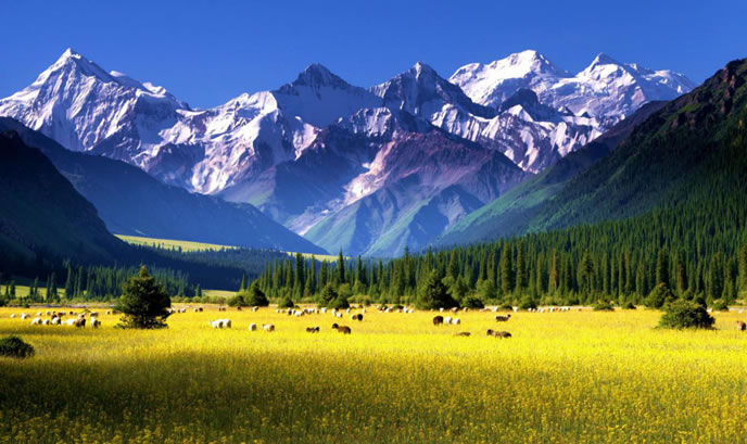 地形地貌 昭蘇縣為中亞內(nèi)陸腹地一個群山環(huán)抱的高位山間盆地,由于四周高山環(huán)抱,形成了一個較為獨特的自然生態(tài)環(huán)境,海拔在1323米-6995米之間。南部為天山主脈,山勢雄偉,高峻綿亙,是阻擋南疆沙漠干熱風的天然屏障;北部為烏孫山,呈東西走向,山體較矮;西部受沙爾套山以及哈薩克斯坦境內(nèi)查旦爾山的阻隔,形成一個南、西、北三面高,東部略低的盆地。山地、丘陵與平原之比為4∶1。號稱“天山之父”的汗騰格里峰,位于西南部的中哈邊境線上,海拔6995米,是天山山脈第二大高峰,終年積雪區(qū)達100平方公里以上,是特克斯河的主要水源。是新疆境內(nèi)唯一一個沒有荒漠的縣。