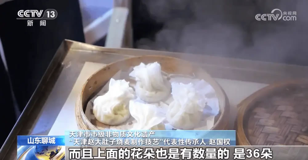 天津市市級(jí)非物質(zhì)文化遺產(chǎn)“天津趙大肚子燒麥制作技藝”代表性傳承人 趙國權(quán):趙大肚子燒麥最大的特點(diǎn)是皮子特別薄,上面的花朵也是有數(shù)量的,是36朵。一邊24朵一邊12朵,代表著中國的24個(gè)節(jié)氣和一年的12個(gè)月份。