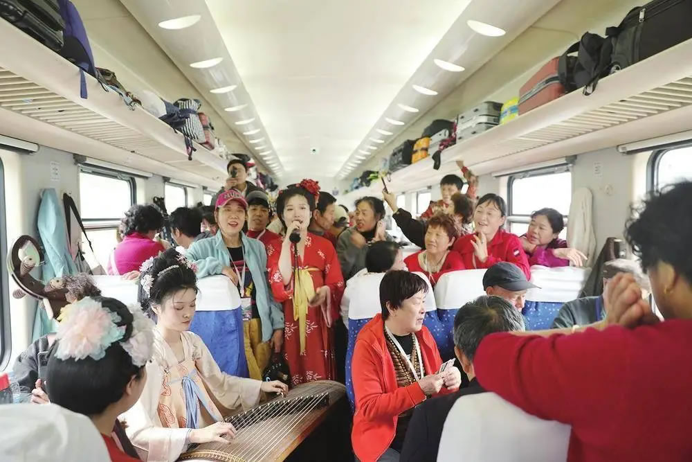 秋日的旅途被一系列精心策劃的活動填滿。候車室內,老年旅客們拉起“環(huán)秦嶺賞秋之旅”的橫幅合影留念,臉上洋溢著笑容;列車上,悠揚的古箏與清越的琵琶聲交織,唐風歌曲緩緩流淌,瞬間讓車廂充滿雅致氛圍。身著古裝的特型演員帶來了驚喜互動,他風度翩翩地與旅客們展開詩詞對答。旅客們踴躍接句,答對的人還能獲得定制小禮品,車廂內歡聲笑語不斷。