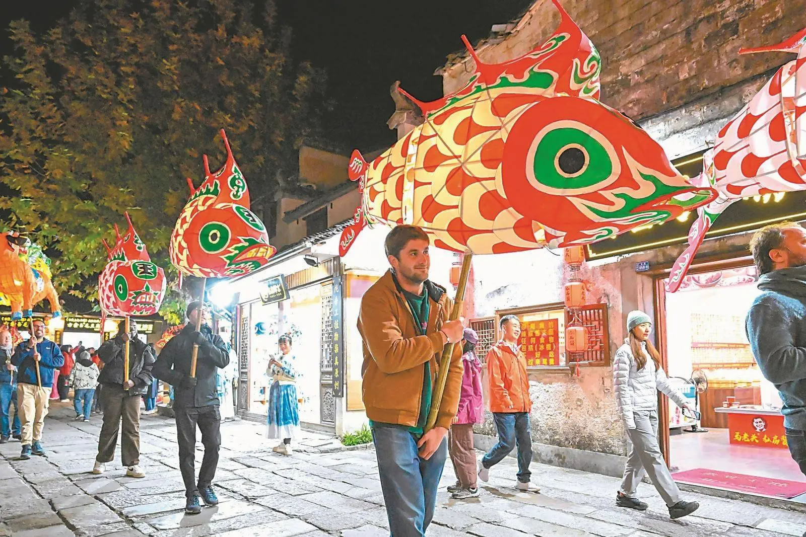11月15日,在黟縣宏村景區(qū),外國游客在體驗(yàn)非遺魚燈表演。通訊員趙明攝