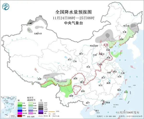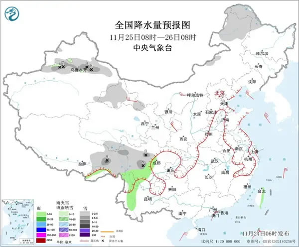 中國(guó)天氣網(wǎng)訊 進(jìn)入11月下旬,影響我國(guó)的冷空氣較為頻繁。目前,一股較強(qiáng)冷空氣正自西向東影響我國(guó),今明天(11月24日至25日),冷空氣繼續(xù)東移南下,東北、華北東部到華南等地都將出現(xiàn)降溫。緊接著,25日至27日,又將有新一股冷空氣影響我國(guó)。此外,我國(guó)西南地區(qū)、東北等地雨雪天氣頻繁,局地或現(xiàn)大雪。