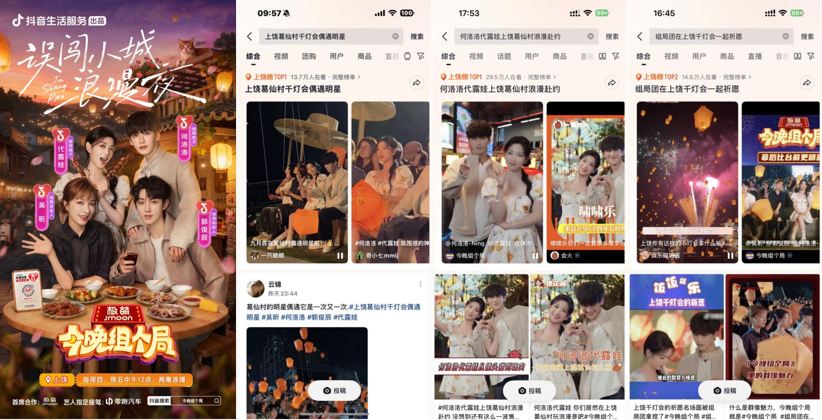 抖音牽手“秋日男友”魏哲鳴前往江西上饒葛仙村拍攝文旅宣發(fā)視頻引發(fā)廣泛關(guān)注,路透內(nèi)容#在葛仙村偶遇魏哲鳴 登上上饒同城榜TOP1;主視頻發(fā)布后,#江西的秋日封神時(shí)刻 更登頂同城榜及全國(guó)種草榜TOP6。活動(dòng)還與綜藝《今晚組個(gè)局》實(shí)現(xiàn)聯(lián)動(dòng),吳昕、代露娃、郭俊辰、何洛洛等明星演員前往上饒拍攝定制化文旅內(nèi)容,#上饒葛仙村千燈會(huì)偶遇明星 #何洛洛代露娃上饒葛仙村浪漫赴約 等路透內(nèi)容與節(jié)目看點(diǎn)登頂上饒同城榜TOP1,#組局團(tuán)在上饒千燈會(huì)一起祈愿 搶占同城榜TOP2。明星效應(yīng)有效激發(fā)用戶出行意愿,葛仙村交易額同比403%顯著增長(zhǎng),持續(xù)引爆目的地&商家出圈。