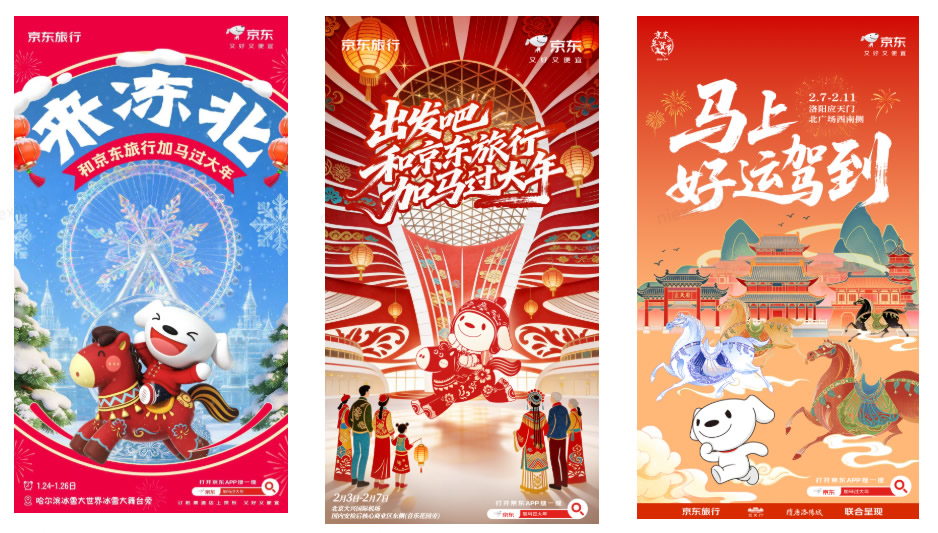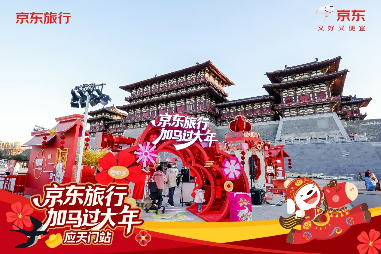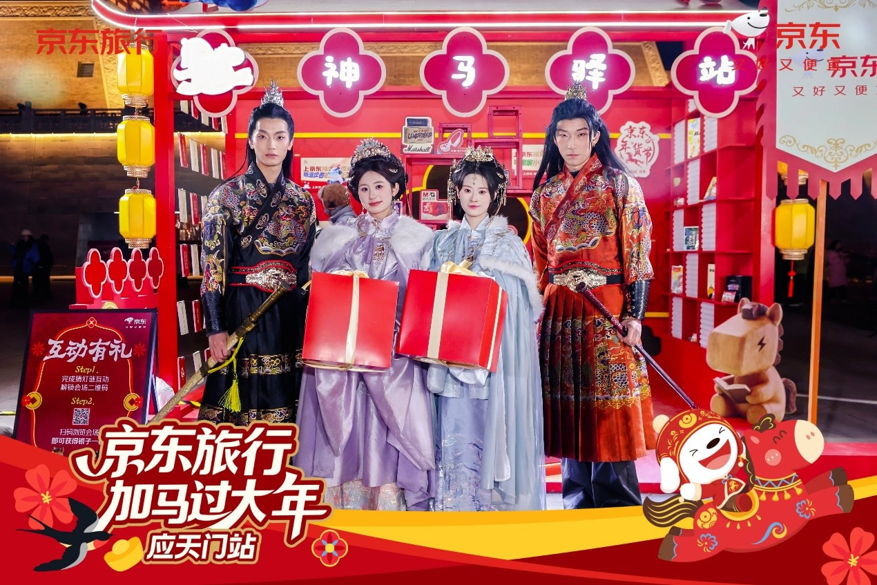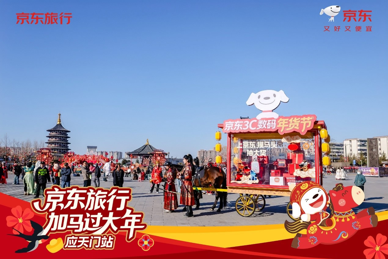 與此同時(shí),在洛陽應(yīng)天門景區(qū),京東旅行攜手京東數(shù)碼、京東物流、伊利等品類品牌,以“國風(fēng)快閃”為核心形式,融合真實(shí)馬匹巡游、唐風(fēng)NPC互動、馬車送年貨等話題事件,將傳統(tǒng)文化場景與品牌產(chǎn)品自然嫁接,不僅強(qiáng)化了景區(qū)文化體驗(yàn)的鮮活感,更通過“真馬營銷”等創(chuàng)新手段在社交平臺形成二次傳播,成功塑造了“文旅+品牌”的場景營銷新范式。