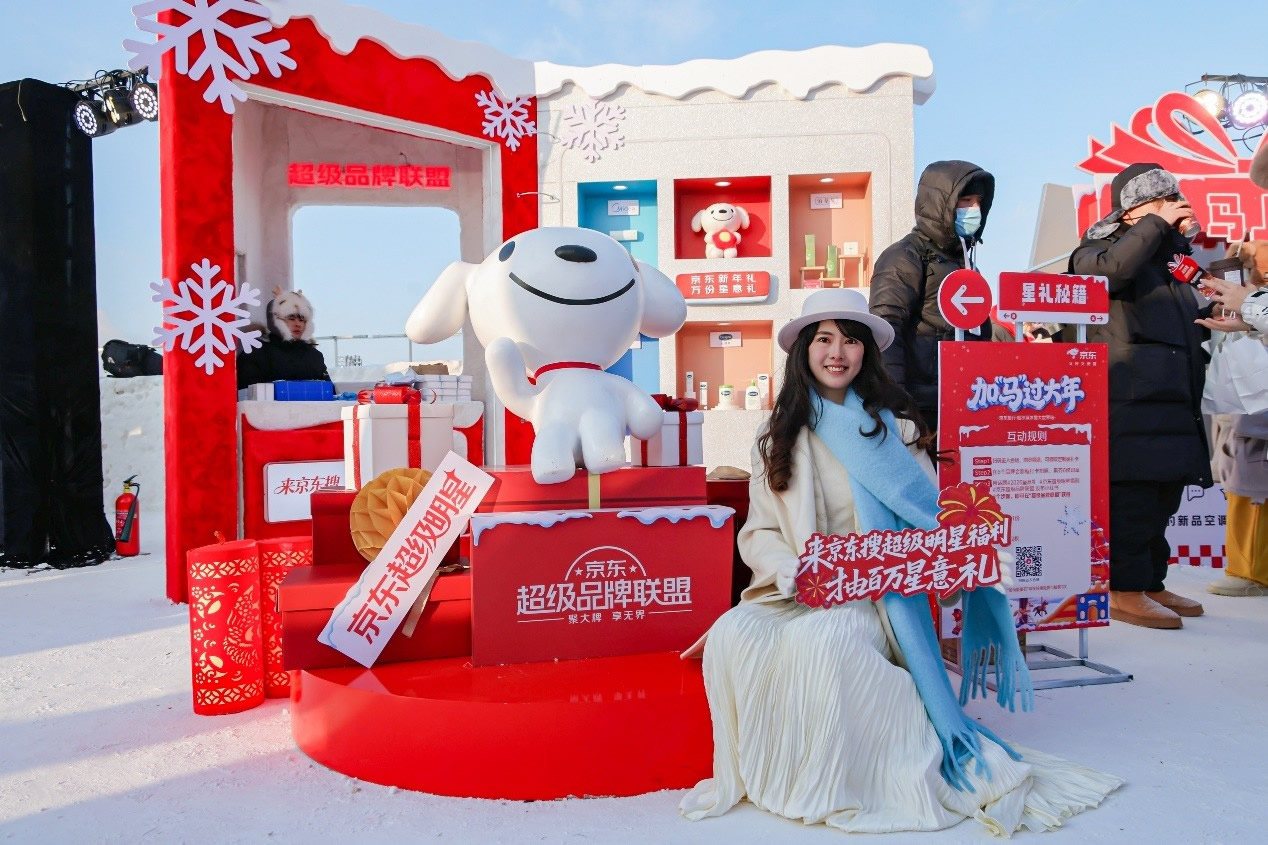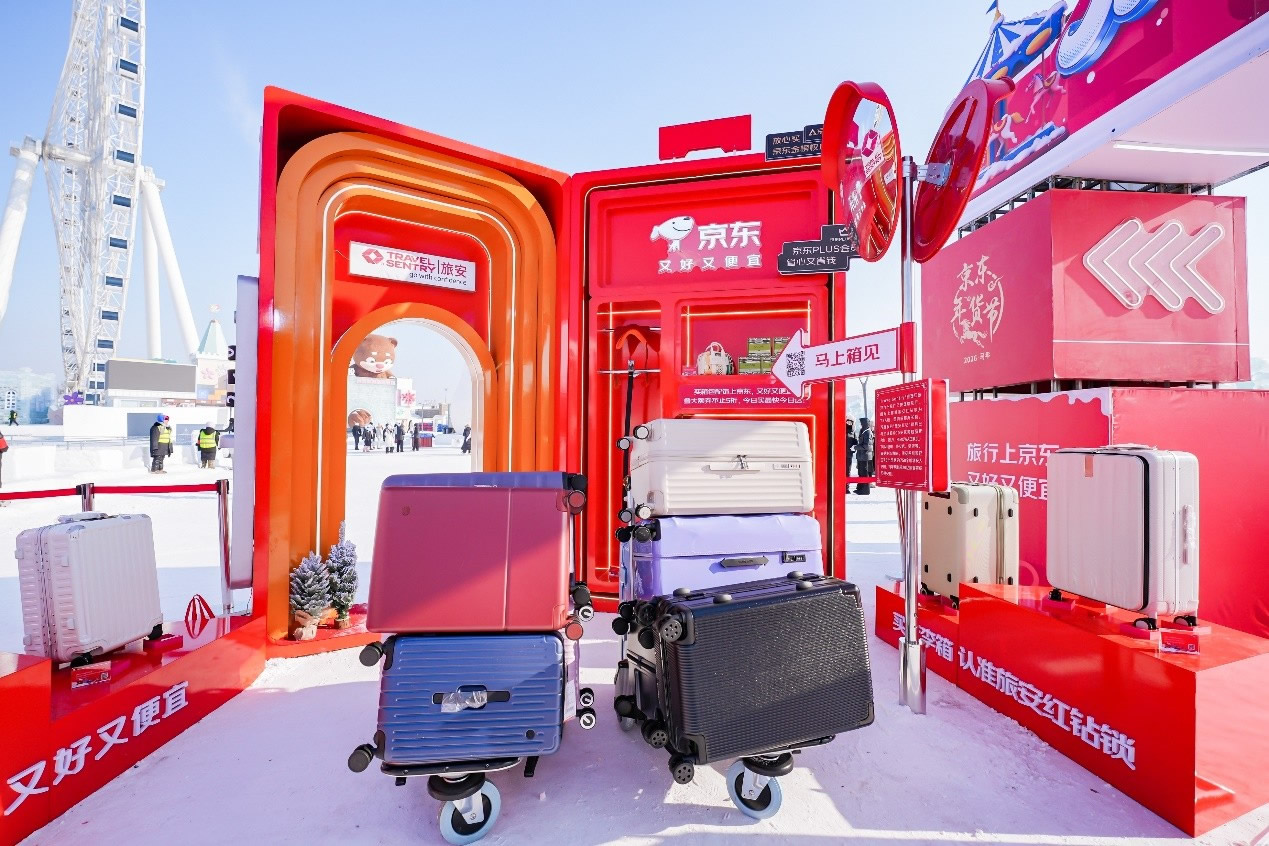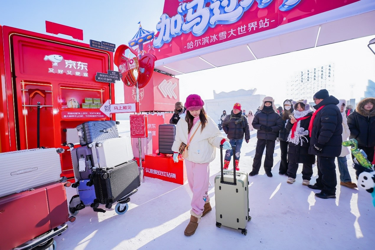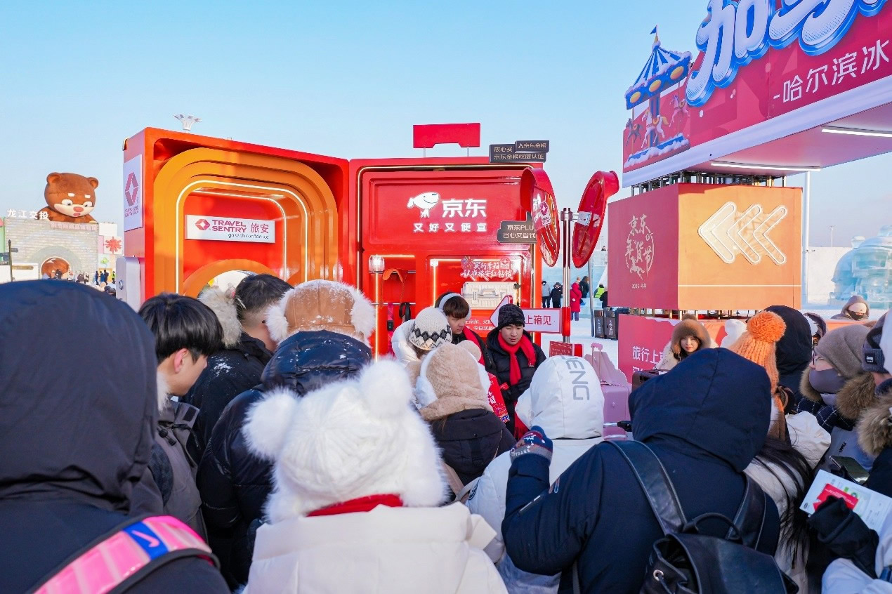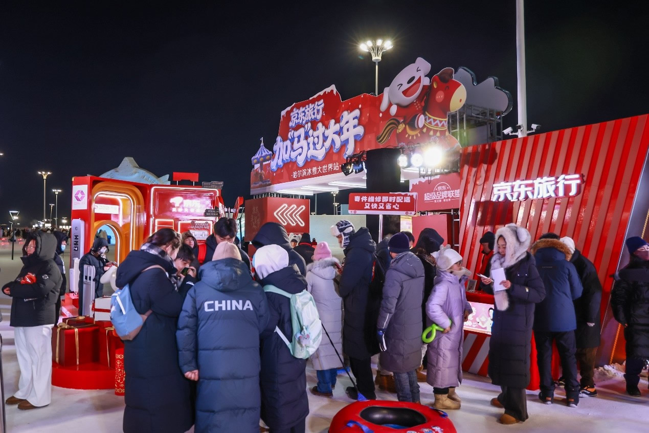京東旅行在此次年貨節(jié)中深度融合兩大頂流文旅場景,實(shí)現(xiàn)線下事件與品牌傳播的雙重引爆。在哈爾濱冰雪大世界,京東旅行攜手京東箱包、京東健康、超級品牌聯(lián)盟、旅安、歐舒丹等品類品牌,依托其冬季頂流景區(qū)的話題熱度,通過多維互動營銷方式打造沉浸式跨界體驗(yàn):不僅設(shè)置“冰雪年貨快閃活動”開展品牌展示與互動游戲,更通過地標(biāo)冰雪摩天輪、無人機(jī)表演、冰雪大舞臺廣告/立體字/主持人口播、區(qū)域植入品牌立體廣告等豐富營銷形式,共同實(shí)現(xiàn)品牌與景區(qū)流量的深度共振。