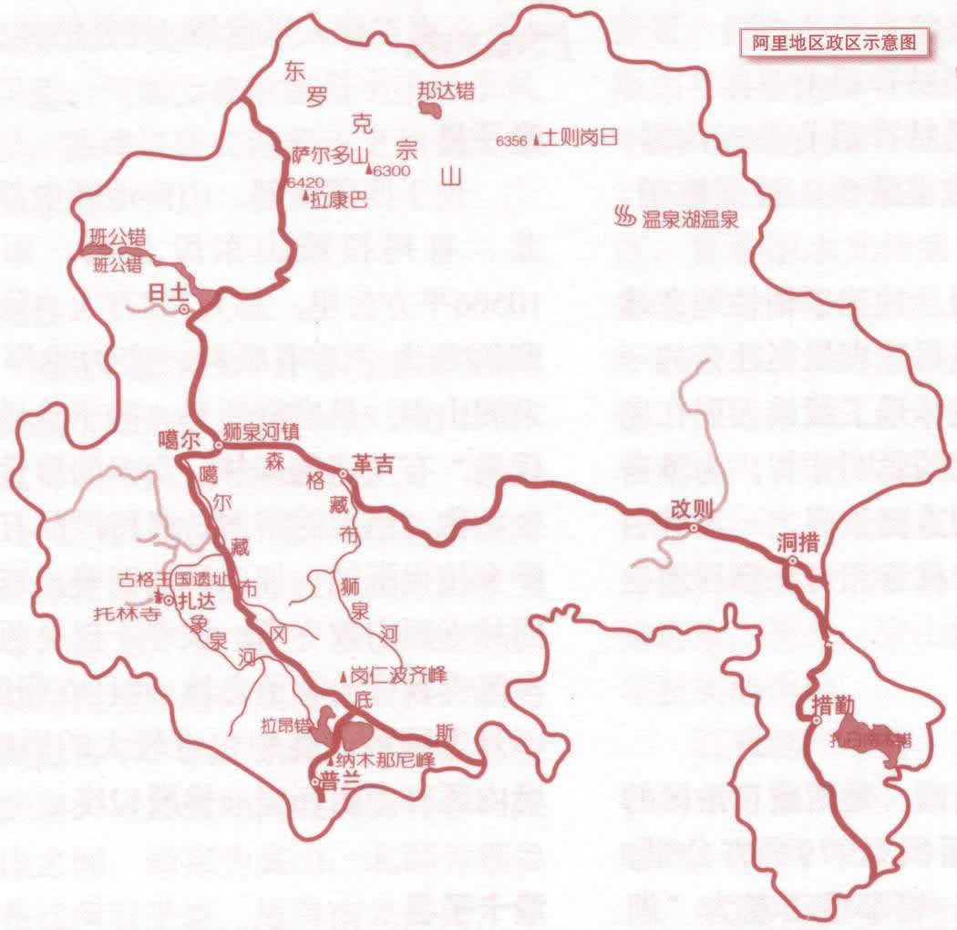 阿里,位于西藏自治區(qū)西部,與印度、尼泊爾、克什米爾地區(qū)接壤,全地區(qū)面積約30萬余平方公里,平均海拔4500米,共轄七個縣,人口僅六萬。是世界上人口密度最小的地區(qū)。阿里是喜馬拉雅興山脈、岡底斯山喀喇昆侖山脈和昆侖山脈相匯聚的地方,又是境內(nèi)外幾條著名江河的發(fā)源地,故而,阿里又被稱為"萬山之祖"、"百川之源"。這里,山巒連綿起伏,湖泊星羅棋布,原野遼遠(yuǎn)無際。因此,阿里的地貌以冰雪、冊巖和湖泊為其特征,歷史上曾經(jīng)把這種特征概括為冰雪圍繞的"普蘭"、巖石圍繞的"古格"、湖泊圍繞的"瑪宇",總稱為"阿里三圍"。