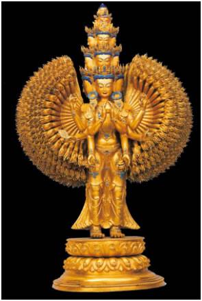 西藏本土制造的宗教文物,以金銅造像最著名。羅布林卡興建之初,七世達(dá)賴為給剛建好的宮殿佛堂添裝佛像及佛教用具,曾在布達(dá)拉宮腳下建立了一所名為“雪堆白”的造像場,匯集了藏區(qū)內(nèi)幾百名能工巧匠,在這里精心打造各種佛像器物,以滿足拉薩及周邊地區(qū)寺院的需求。羅布林卡從初建到最后完善,每座佛堂里的大小佛像都被指定由“雪堆白”工匠量身定做打造。除此之外,園內(nèi)很多佛龕、宗教用具、金頂屋檐、門楣雕飾等,也都出自“雪堆白”工匠之手!把┒寻住痹煜裉攸c是制作精細(xì)、比例勻稱、色彩鮮明艷麗,佛像上的鍍金厚重,鍍金面光潔度高,佛冠、耳墜、臂釧、手鐲、飄帶等飾物,一律用綠松石鑲嵌。這些明顯特征,說明18世紀(jì)中葉以后,西藏本土佛像打造技術(shù)已步入了獨立發(fā)展的成熟階段。