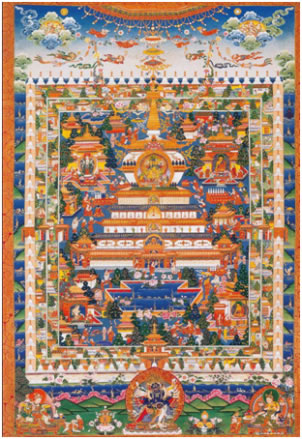 除佛像、佛塔外,唐卡收藏也是一大亮點。羅布林卡珍藏了大量18到20世紀(jì)勉唐畫派、欽則畫派和嘎赤畫派的各類作品。早期唐卡著名的有覺仲師徒像、帕木竹巴·多吉杰布像、印度尊者比瓦巴、那若巴像。其中覺仲師徒像唐卡,描寫的是印度尊者,噶當(dāng)派始祖阿底峽向貼身弟子仲敦巴(師徒合稱“覺仲”)傳授佛法的故事。畫面中心主尊阿底峽頭戴錐形遮耳帽,身披袈裟,雙手結(jié)說法印,給身旁仲敦巴講法,仲敦巴著藏式袍服,結(jié)跏趺坐,側(cè)身聆聽大師教誨。畫面上、下分別繪有如來、藥師、觀音、度母諸佛及繪畫施主像,人物刻畫逼真、栩栩如生,背景以朱砂填色,輪廓用金線勾勒。這件13世紀(jì)繪制的“赤唐”作品,十分稀有,彌足珍貴。另外,在收藏諸多的嘎赤畫派作品中,以84位印度大成就者唐卡最具特色。這些唐卡的畫面,不同以往其他畫派作品,構(gòu)圖較為簡潔,色彩淡雅。人物形態(tài)被描繪的極為夸張,塑造了一個個特殊而詼諧逗趣的大成就者形象。這種一反常態(tài)的畫風(fēng)作品,在外邊難得一見。還有以唐卡形式繪制的《四部醫(yī)典系列掛圖》,收藏也比較完整。系列掛圖,藏族稱為“曼唐”,它是以彩色連環(huán)畫形式系統(tǒng)描述了藏醫(yī)藥學(xué)的基本理論,人類解剖構(gòu)造,生理功能、疾病診斷治療方法,各種藥物種類以及人類如何養(yǎng)生保健、飲食搭配等內(nèi)容!奥啤敝谱魍晟朴谇宕迨肋_(dá)賴?yán)锇⑼迳<未雸?zhí)政時期。最早成79幅,1916年十三世達(dá)賴?yán)锪钊擞衷鲅a(bǔ)了一幅“歷代西藏名醫(yī)圖”,形成80幅。這批系列掛圖,被視為標(biāo)準(zhǔn)藍(lán)本,完整保存在羅布林卡內(nèi)。