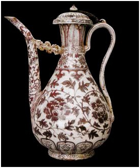 明洪武時期(公元1386年--1398年)贈送的釉里紅牡丹紋執(zhí)壺,高37cm,足徑11cm,這是一件造型端莊美觀大方、繪工精細(xì)、十分鮮見的瓷器。由于釉里紅瓷器燒制難度大,成品率低,在現(xiàn)今中國內(nèi)地保存數(shù)量已很少,而在西藏能完好保存這件瓷品長達(dá)600多年,實屬難得。