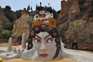 沙內(nèi)滲泉,甘露長(zhǎng)漣,滋沙養(yǎng)人。風(fēng)沙不揚(yáng),水沙不染,冥冥費(fèi)解。依山臨湖,磅礴氣概,天地奉獻(xiàn)。這寰于一絕的奇景,吸向性,潛在力,輻射度,都具有特殊價(jià)值,憑借這一世界獨(dú)有的資源優(yōu)勢(shì),借助沙雕藝術(shù)魅力,經(jīng)過(guò)精心策劃,認(rèn)真組織,于2001年至今成功舉辦了五屆主題分別為“千年夢(mèng)幻”、“走進(jìn)名著”、“五洲風(fēng)采”、“音樂(lè)神采”、“爨史風(fēng)情”的全球首創(chuàng)、世界唯一的國(guó)際彩色沙雕節(jié)暨沙雕大賽。