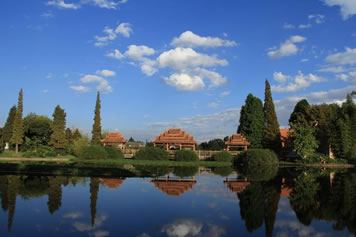 傣族寨是進(jìn)入民族村的第一個(gè)村寨,占地面積27畝,三面環(huán)水,綠樹掩映。一幢幢“干欄式”傣家竹樓,通過蜿延的紅砂石小徑聯(lián)向肅穆的緬寺。巍峨壯觀的白塔,精巧玲瓏的風(fēng)雨橋,以及風(fēng)雨亭、水井、鐘亭等建筑充滿著傣家的濃郁風(fēng)情,是傣寨真實(shí)的民間景觀再現(xiàn) 。