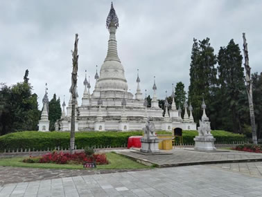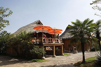 德昂村建筑納入了能容納數(shù)十人居住的德昂大房子,氈帽頂?shù)男》孔樱有頗具浪漫色彩的大公房、小公房……還建有“龍陽(yáng)塔”標(biāo)志及佛教奘房、佛塔。