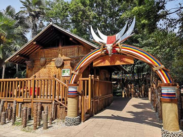 云南民族村景頗寨占地15畝,有寬敞大方的各式民居建筑和精美華麗的”山官房”。建筑形式集中表現(xiàn)了景頗族“干欄式”、“倒T型”等結(jié)構(gòu)特征和布局形制。廣場(chǎng)中央豎立著“目腦縱歌示棟”。圖案和雕塑象征著景頗族人民團(tuán)結(jié)向前的意愿和驍勇剛毅的性格。景頗族信仰萬物有靈的原始宗教,信奉鬼神,崇拜祖先。