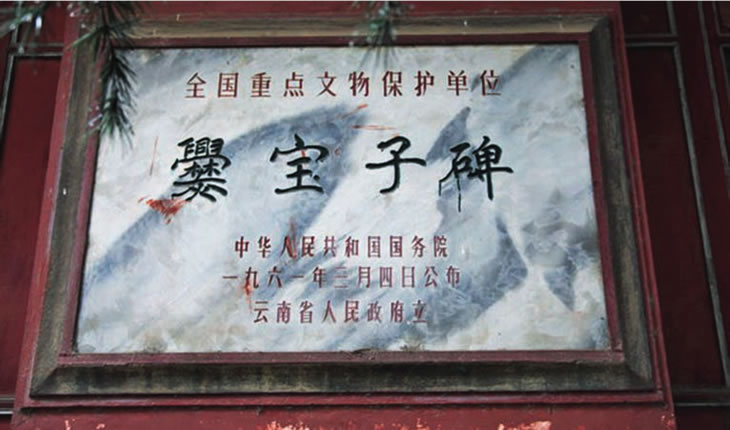 在越州楊旗出土的爨寶子碑全稱為“晉故振威將軍建寧太守爨府君墓”碑,立于東晉大亨四年(公元405年)!鹅鄬氉颖肥请`書向楷書過渡的典型碑刻;碑文通篇為六朝時(shí)期的駢文體;也是研究南北朝時(shí)期云南地方史不可多得史料。1961年,國務(wù)院將其公布為第一批全國重點(diǎn)文物保護(hù)單位。存于曲靖一中。