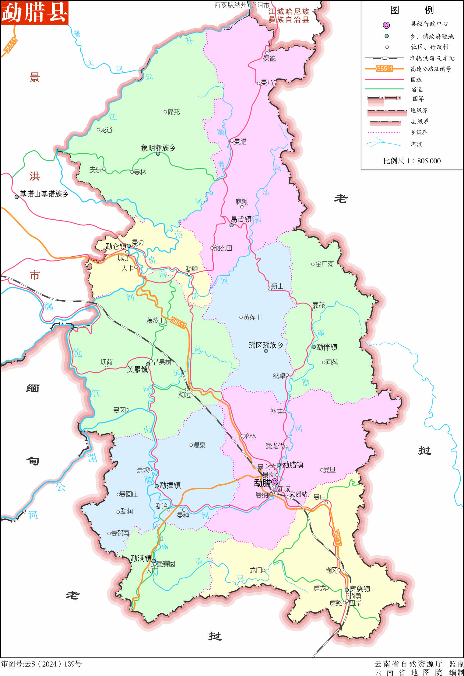 鎮(zhèn):勐臘鎮(zhèn)、勐捧鎮(zhèn)、勐侖鎮(zhèn)、關(guān)累鎮(zhèn)、勐滿鎮(zhèn)、勐伴鎮(zhèn)、尚勇鎮(zhèn)、易武鎮(zhèn)