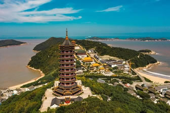 南海觀音立像位于普陀山風(fēng)景名勝區(qū)之東南的龍灣崗巔。這一尊南海觀音立像總高33米,其中臺(tái)基高13米,銅像高18米,蓮花座為2米,重70多噸。佛像基層是面積1000多平方的功德廳,上層供奉500尊形態(tài)各異的觀音銅像,下層大廳飾有觀音靈異故事的大型黃楊木雕和以普陀山風(fēng)景名勝區(qū)景色為題材的彩玉浮雕。