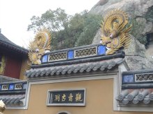 法雨寺又稱后寺,初名海潮庵,清康熙三十八年(1699年)賜“天華法雨”額,遂稱法雨禪寺。建筑布局依山取勢(shì),分群遞升。其中九龍殿最為輝煌,該佛殿是從南京明故宮整體搬遷而來(lái)的,殿內(nèi)有普陀山三寶之一的“九龍?jiān)寰薄?