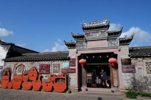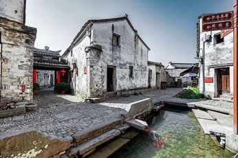 老街兩旁都是長(zhǎng)板門面的店鋪。緊鄰老街是一幢幢至今保存完整的古建筑群,梁枋門窗上滿是雕飾,精巧的躍魚馬頭墻和脊塑墻花具有獨(dú)特的地方風(fēng)格。馬頭墻是古代江南富戶官宅威勢(shì)的象征,據(jù)說級(jí)數(shù)越多,職位越高。墻面嵌著雕花石窗,外墻上塑浮雕文字,墻尖塑著沖天而起的躍魚和飛龍,寓含“鯉魚跳龍門”之意。門柱上那兩只活動(dòng)的倒掛獅子,門墻上一對(duì)瓷盆中各飾有5只飛舞的蝙蝠,象征著五福臨門。大祠堂建于明洪武十八年。大廳有32根大圓柱,好比32顆象棋子,隱含全局一盤棋之意;每根柱子中間大,兩頭小,是典型的隋唐風(fēng)格明式建筑。